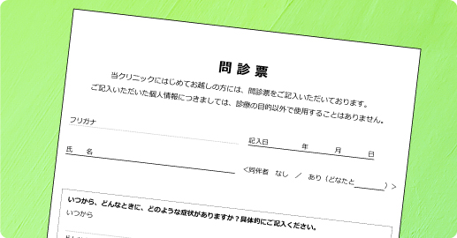 - 初診をご希望の方はまずお電話にてご予約ください。なお、受診には患者さまご本人の受診意思が必要となります。ご本人の受診意思がない場合は予約をお取りできませんのであらかじめご了承ください。詳しくは下記のページをご覧ください。